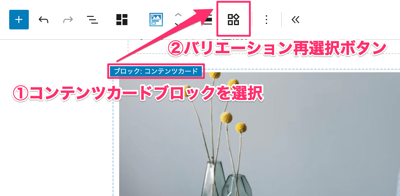 適用したバリエーションをキャンセルし、別のバリエーションを選び直す場合は、「コンテンツカード」ブロックを選択(アクティブ)にした状態で表示される、ツールバーのバリエーション再選択ボタンをクリックすることで再びバリエーションピッカーを表示できます。