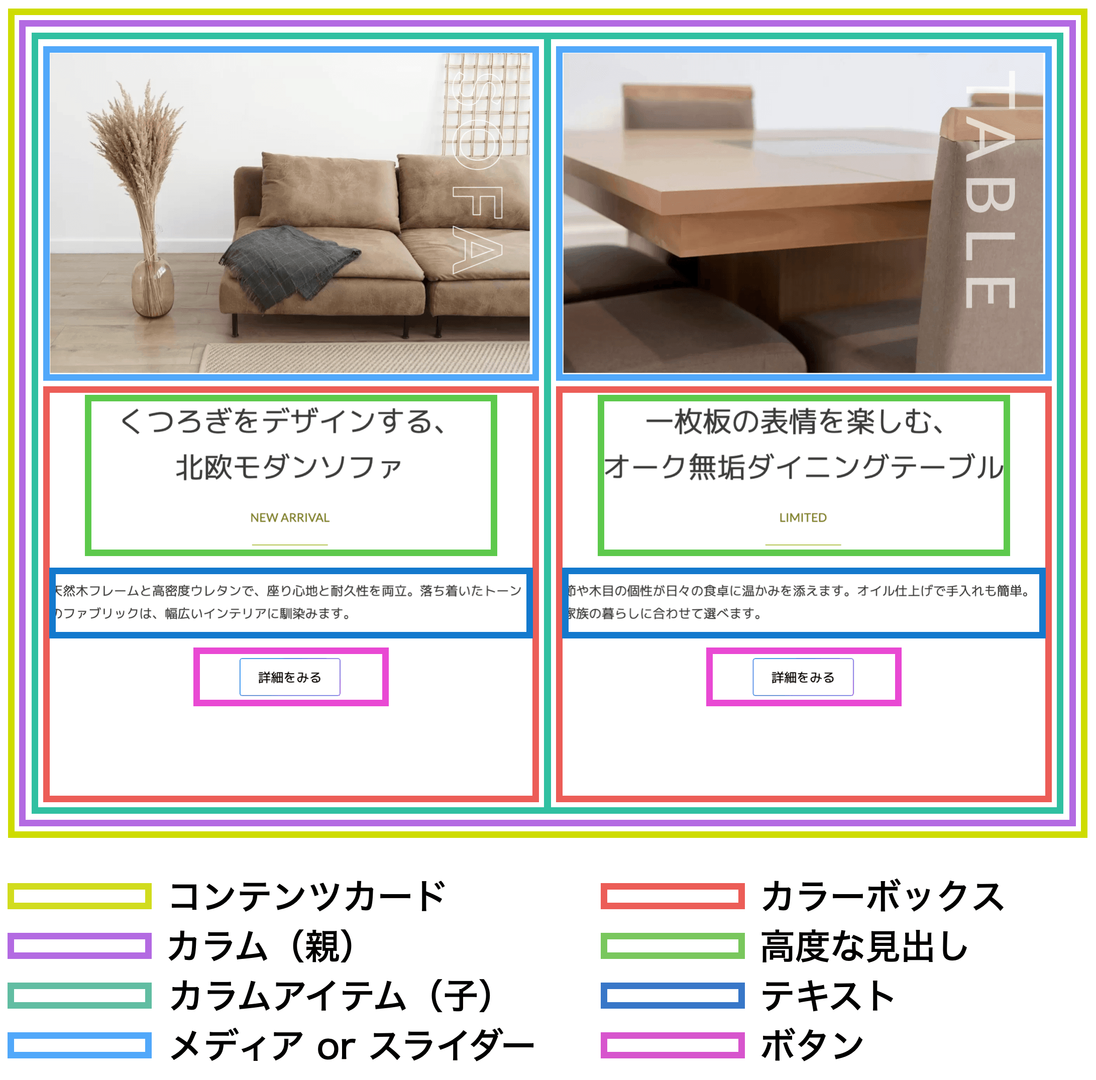 このブロックは、既存のカスタムブロック(「カラム」、「メディア」、「スライダー」、「高度な見出し」、「ボタン」)を組み合わせてコンテンツを構成するボックス型ブロックです。
