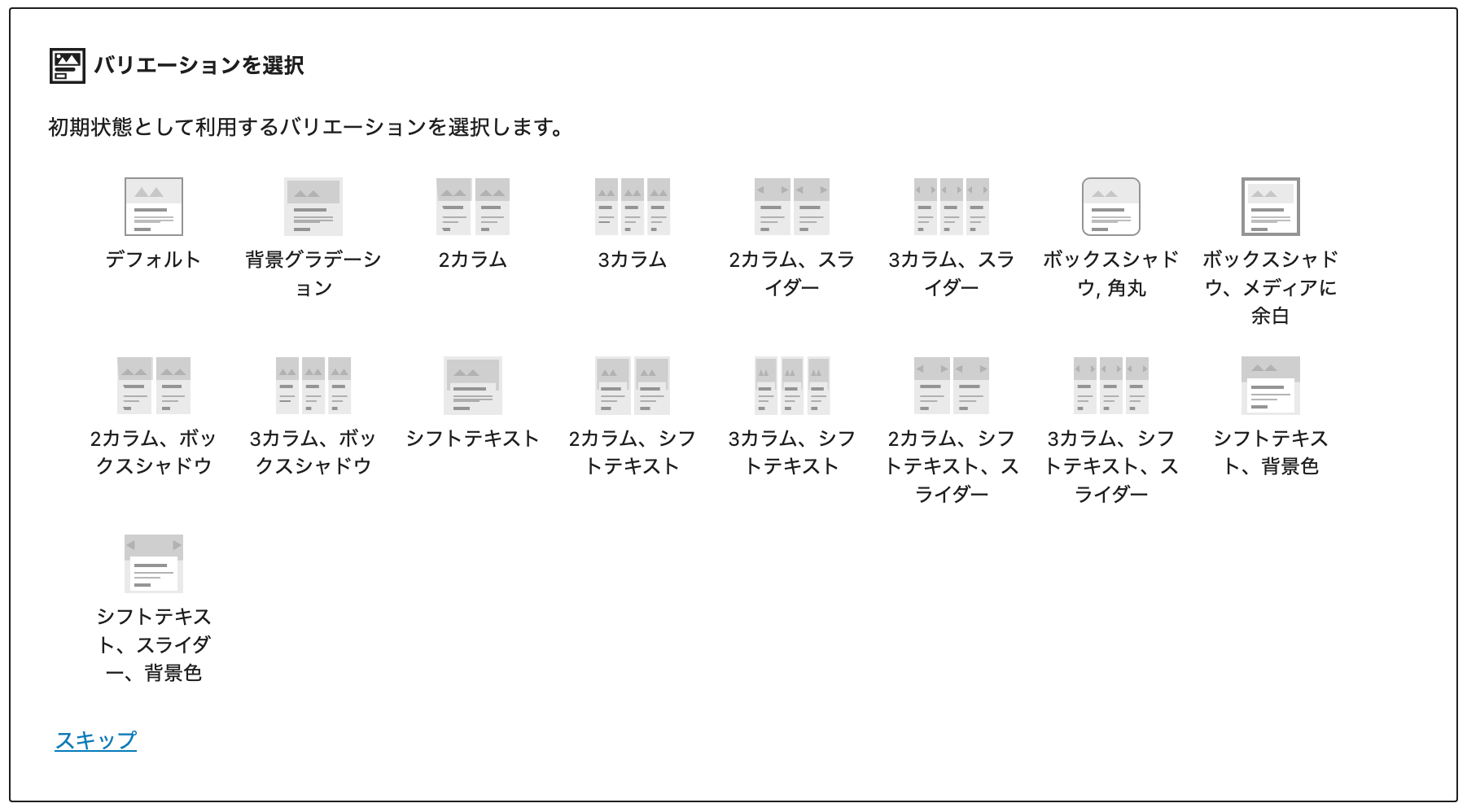 ブロック追加直後は、以下のようにバリエーションピッカーが表示され、予め用意されているブロックの構成のパターンから任意のものを選び、コンテンツカードブロックの初期状態を表示してから各ブロックをカスタマイズします。