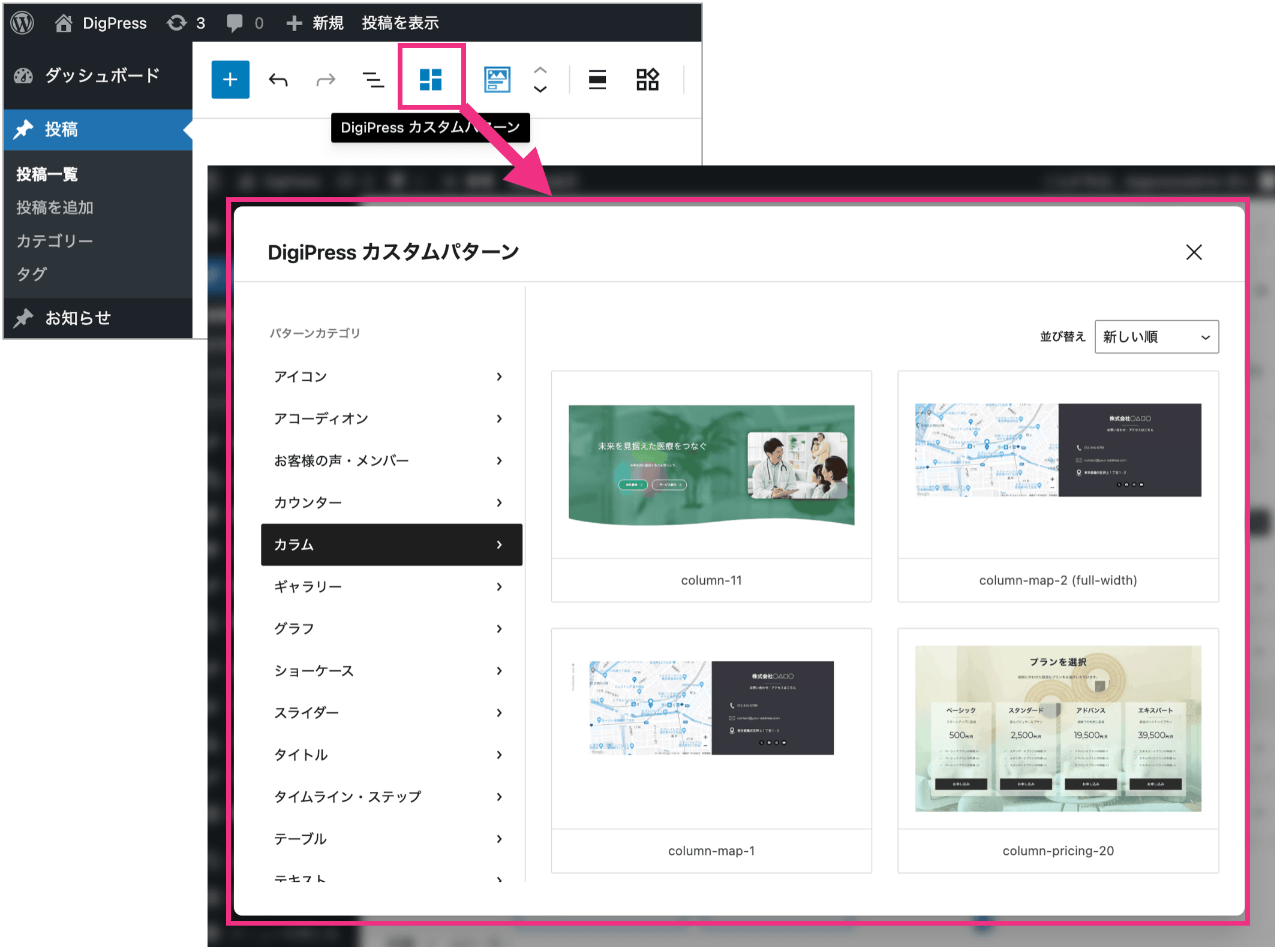 ツールバーボタンから「DigiPress カスタムパターン」のポップアップを表示し、様々なブロックを組み合わせたカスタムパターンを探し、すぐにブロックエディタ内に復元することができます。