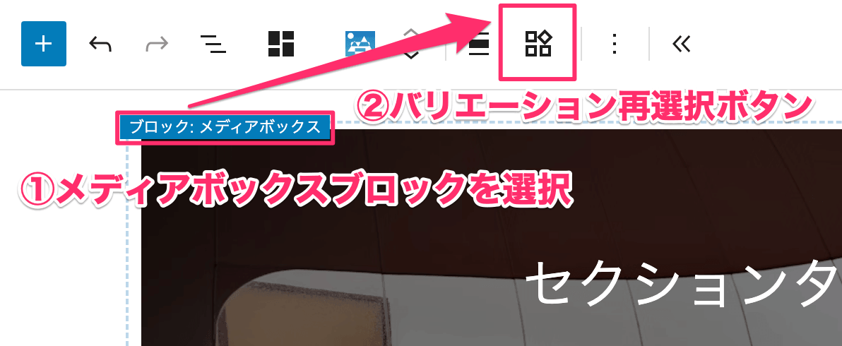 適用したバリエーションをキャンセルし、別のバリエーションを選び直す場合は、「メディアボックス」ブロックを選択(アクティブ)にした状態で表示される、ツールバーのバリエーション再選択ボタンをクリックすることで再びバリエーションピッカーを表示できます。