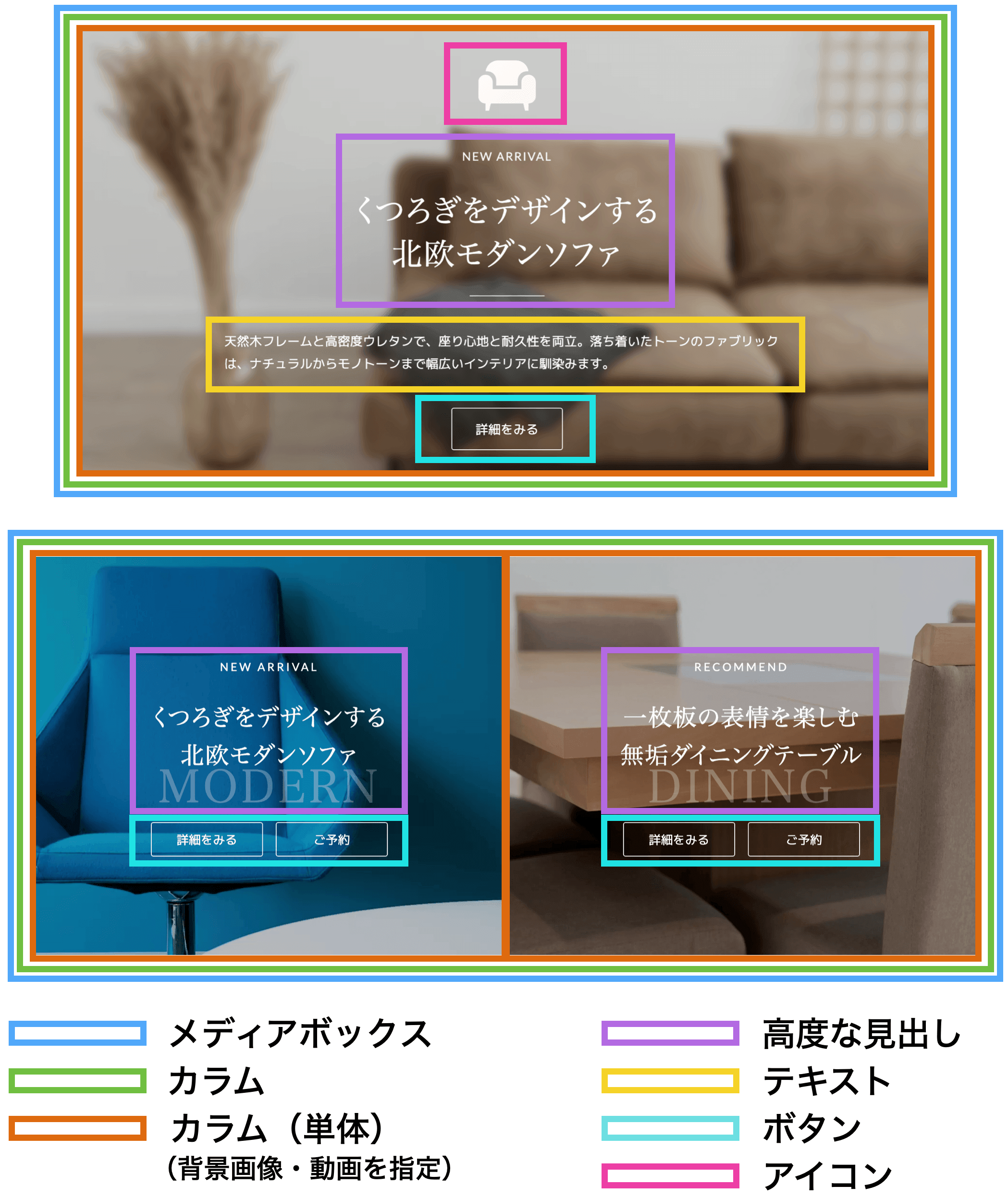 このブロックは、既存のカスタムブロック(「カラム」、「高度な見出し」、「テキスト」、「ボタン」等)を組み合わせ、画像または動画を背景にし、前景にテキストコンテンツを表示するボックス型ブロックです。