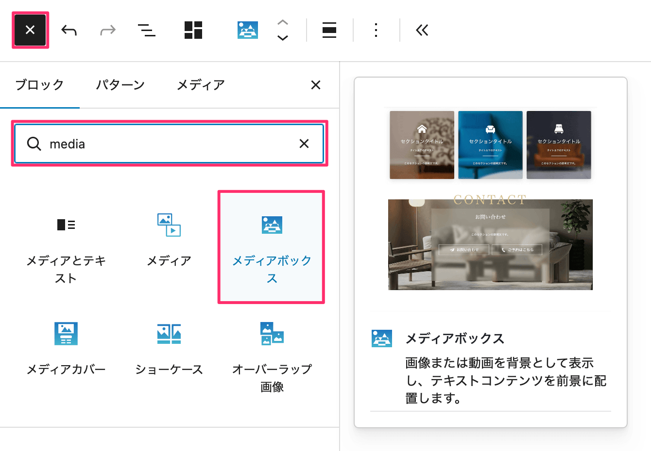 ブロックを追加するには、ブロックインサーターボタンで一覧を開き、検索フォームに「メディア」、「ボックス」、「media」、「box」、「digipress」などと入力して検索し、追加します。
