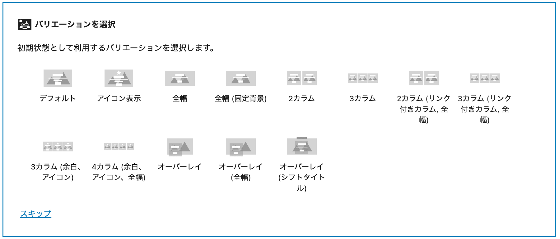 ブロック追加直後は、以下のようにバリエーションピッカーが表示され、予め用意されているブロックの構成のパターンから任意のものを選び、メディアボックスブロックの初期状態を表示してから各ブロックをカスタマイズします。