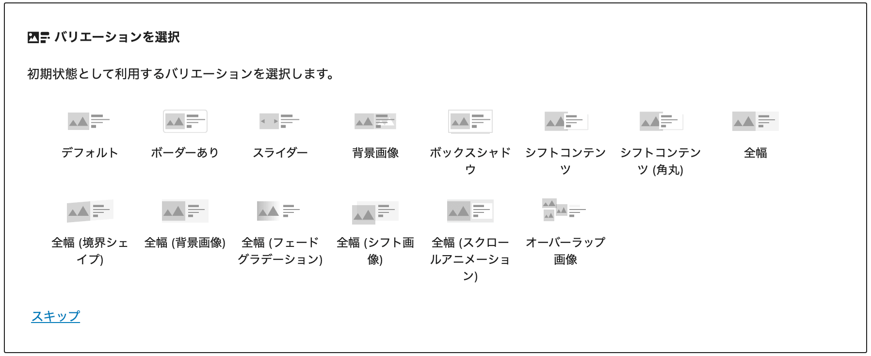 ブロック追加直後は、以下のようにバリエーションピッカーが表示され、予め用意されているブロックの構成のパターンから任意のものを選び、セクションヘッダーブロックの初期状態を表示してから各ブロックをカスタマイズします。