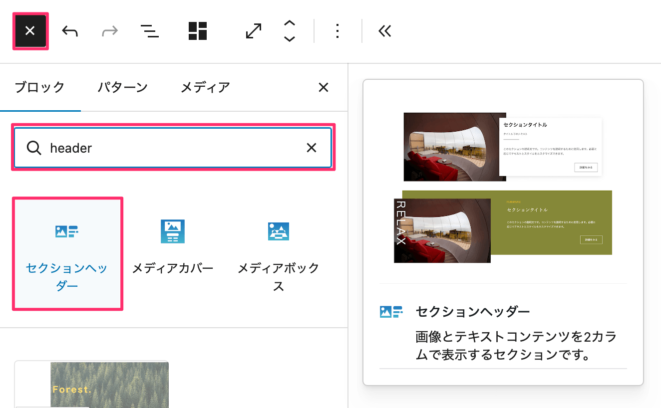 ブロックを追加するには、ブロックインサーターボタンで一覧を開き、検索フォームに「セクション」、「ヘッダー」、「section」、「header」、「digipress」などと入力して検索し、追加します。