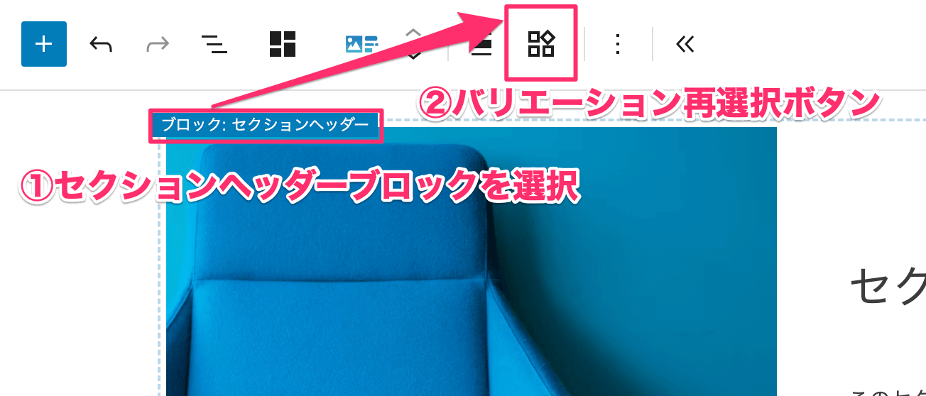 適用したバリエーションをキャンセルし、別のバリエーションを選び直す場合は、「セクションヘッダー」ブロックを選択(アクティブ)にした状態で表示される、ツールバーのバリエーション再選択ボタンをクリックすることで再びバリエーションピッカーを表示できます。