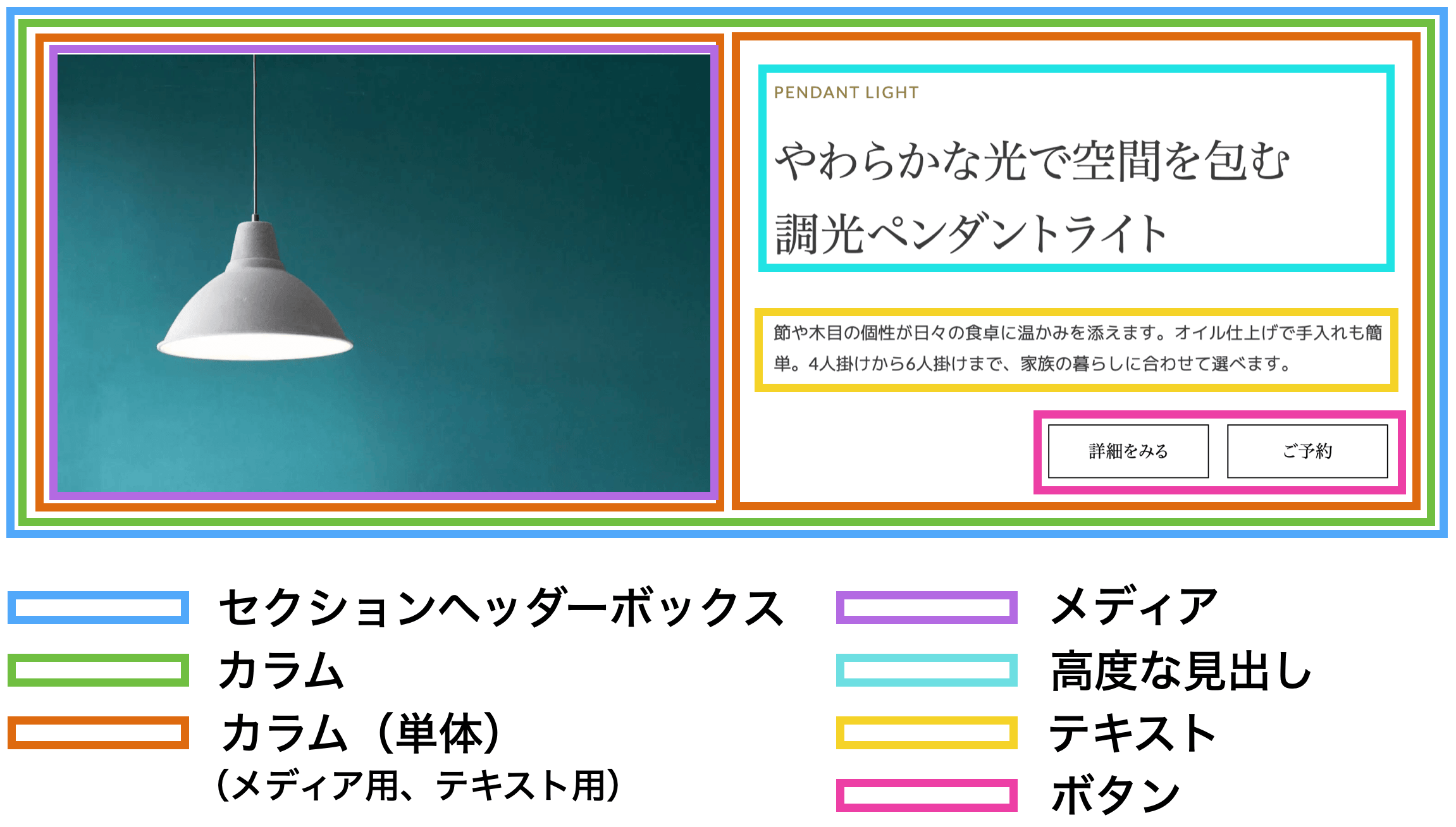 このブロックは、既存のカスタムブロック(「カラム」、「メディア」、「高度な見出し」、「テキスト」、「ボタン」等)を組み合わせてセクションヘッダー用のコンテンツを表現するボックス型ブロックです。