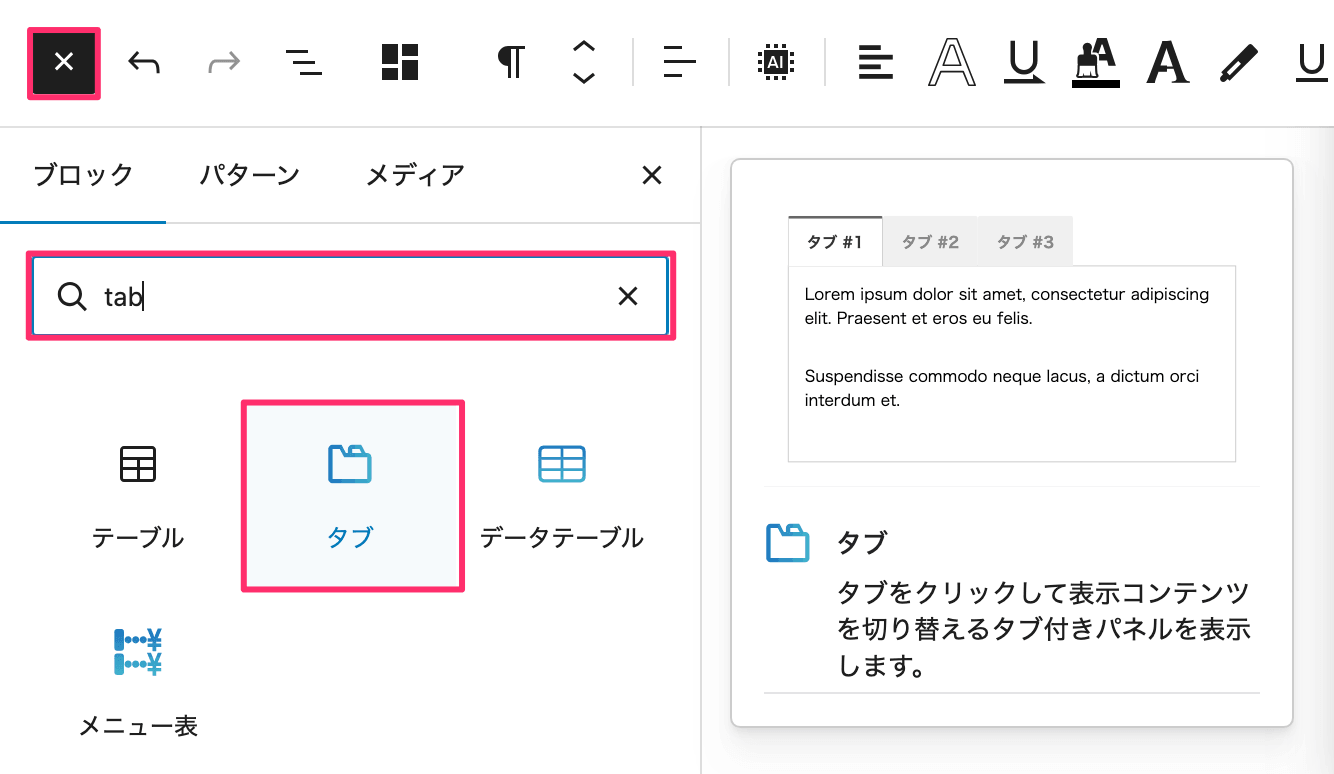 「タブ」ブロックは、ブロック追加ボタンで一覧を開き、検索フォームに「タブ」や「tab」、「digipress」などと入力して検索し、追加します。
