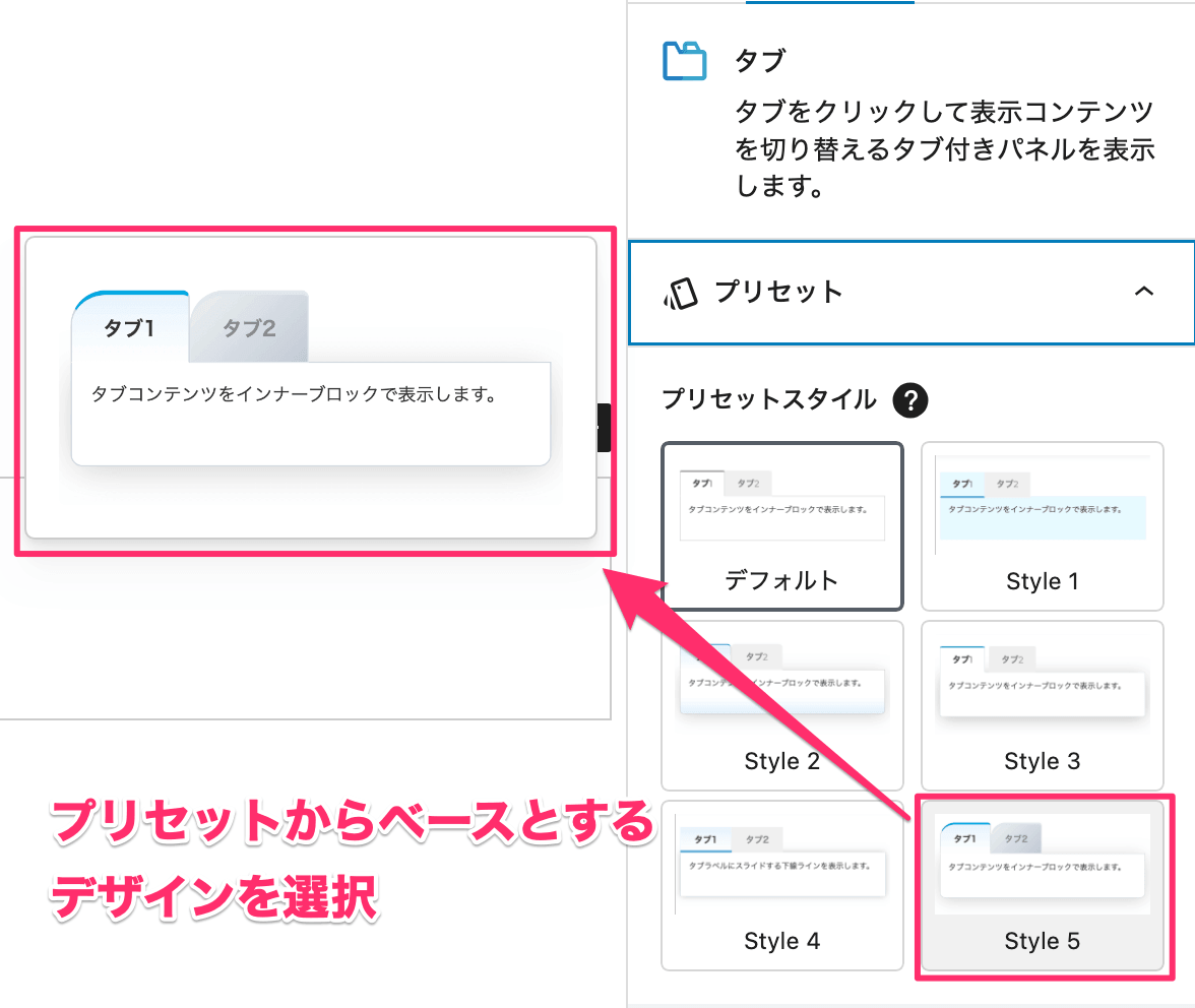 右側サイドバーの「プリセット」パネルでは、デフォルトの状態を含め、予めカスタマイズされたタブデザインのパターンからベースとするものを選んでから、要件に合わせてさらに細かいカスタマイズを行うことができます。