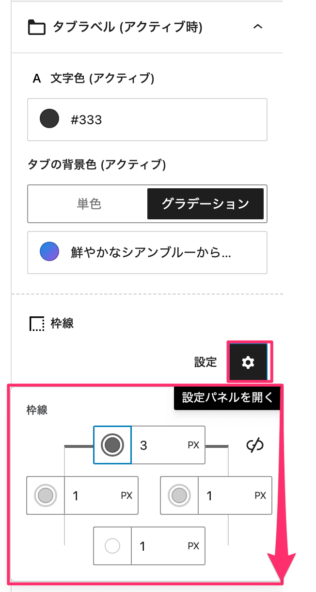 - タブコンテンツエリア(タブアイテムブロック)のボーダー