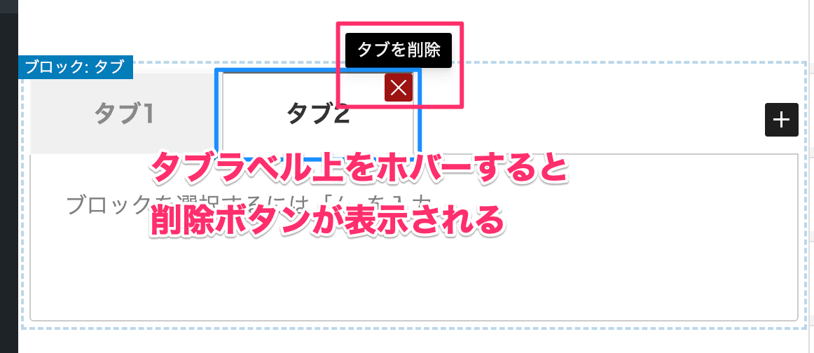 タブラベルをホバーしたときに表示される赤色のタブ削除ボタンから、タブラベルと共に対象のタブアイテムブロック(子)をタブブロック(親)から削除します。