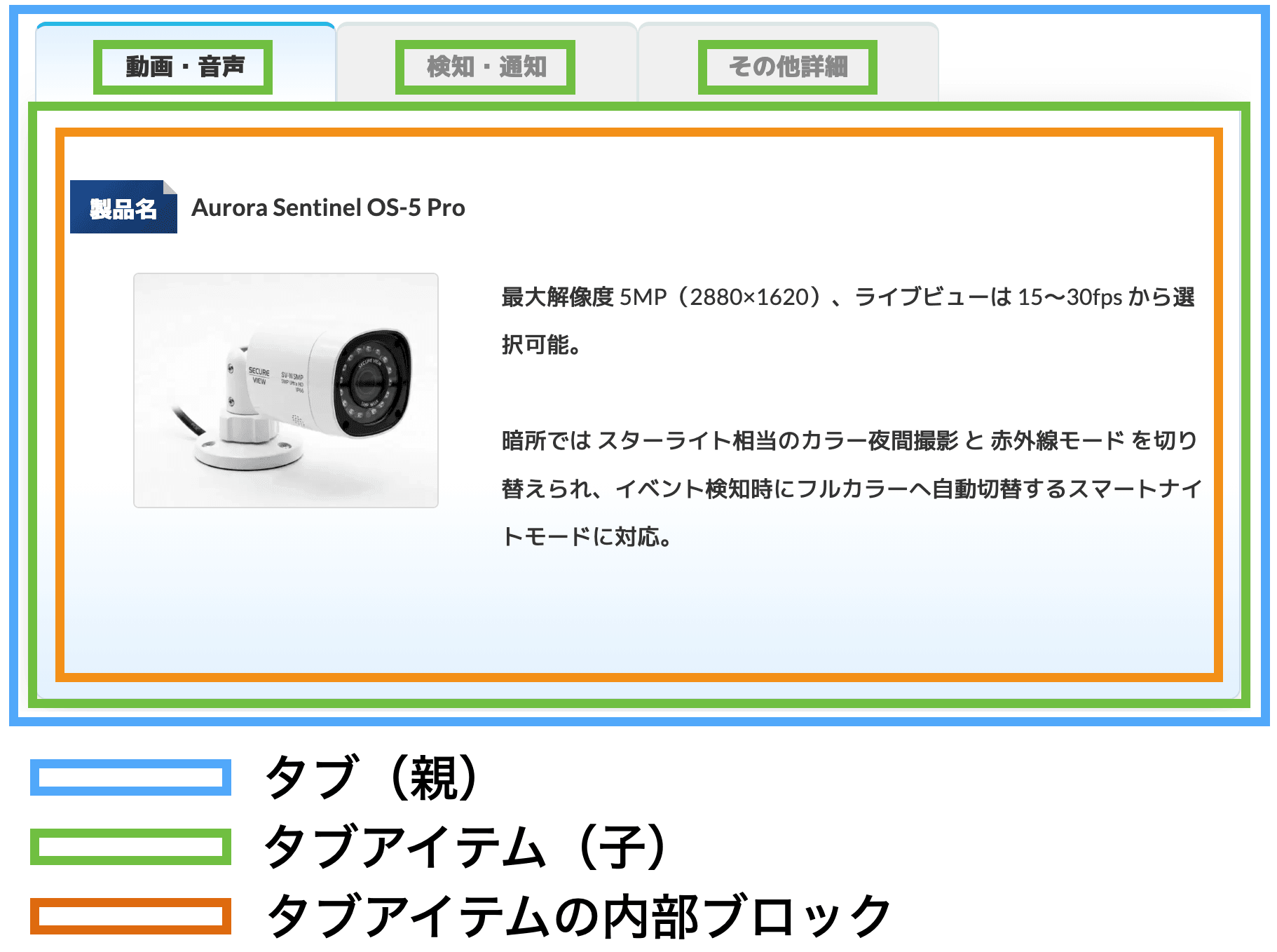 タブブロック(親)は、内部にタブアイテムブロック(子)を持ち、タブの数だけタブアイテムブロックが存在します。