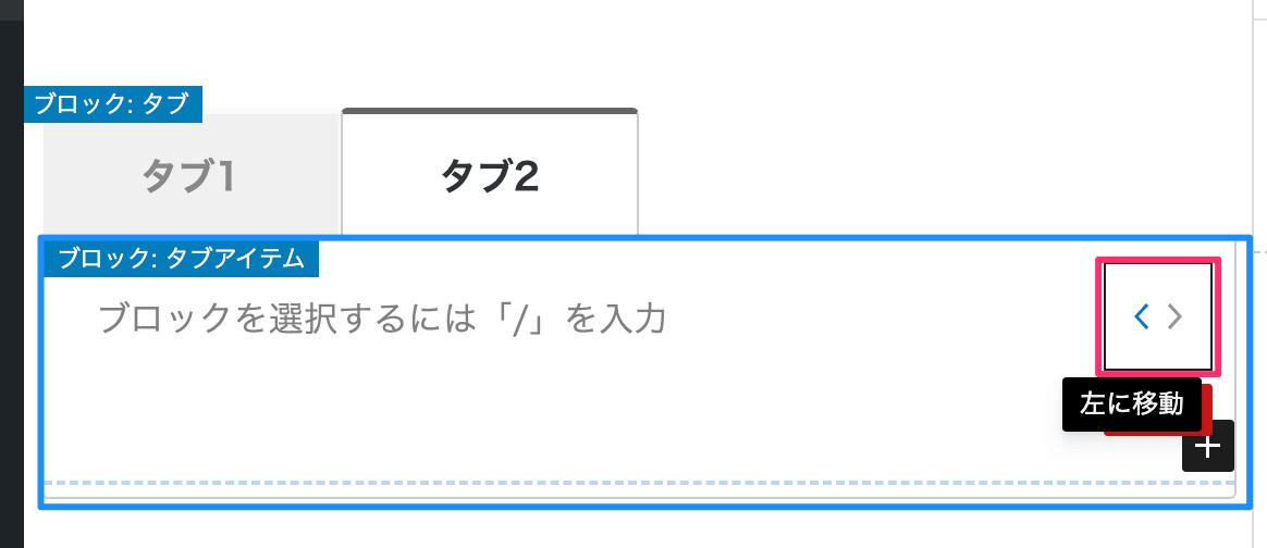 タブの順番を入れ替える場合は、タブアイテムブロックを選択すると右側に表示されるブロック移動ボタンから操作します。