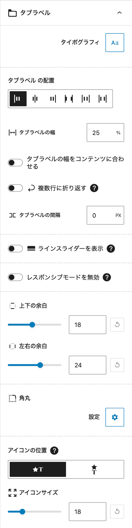 右側サイドバーの「タブラベル」パネルでは、アクティブ・非アクティブに共通するタブラベル(タイトル)のタイポグラフィや配置、その他ベースのデザインについて調整します。