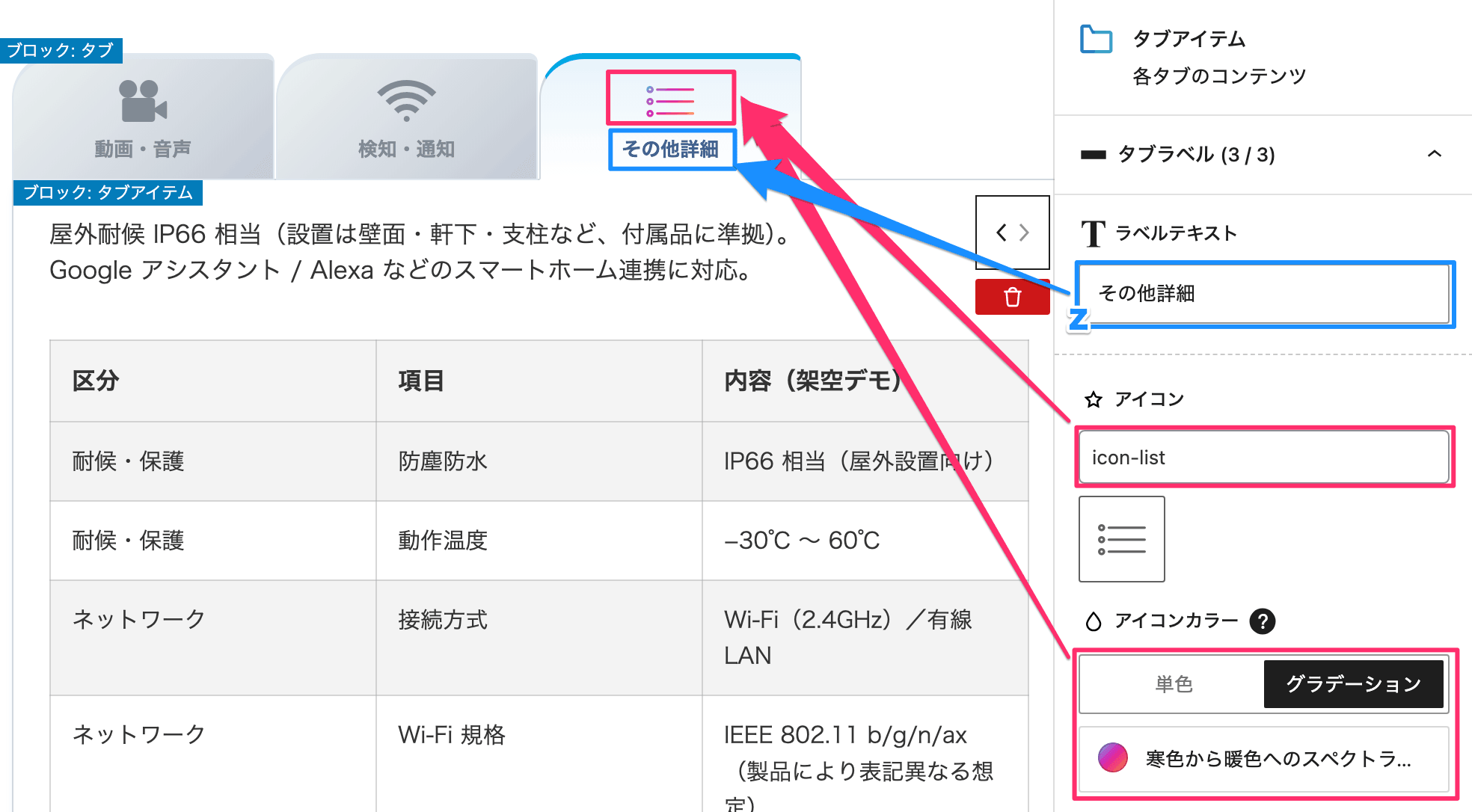 タブアイテムブロックは内部に任意のブロックを追加することができ、タブごとに分けて表示したいコンテンツを自由に作成します。