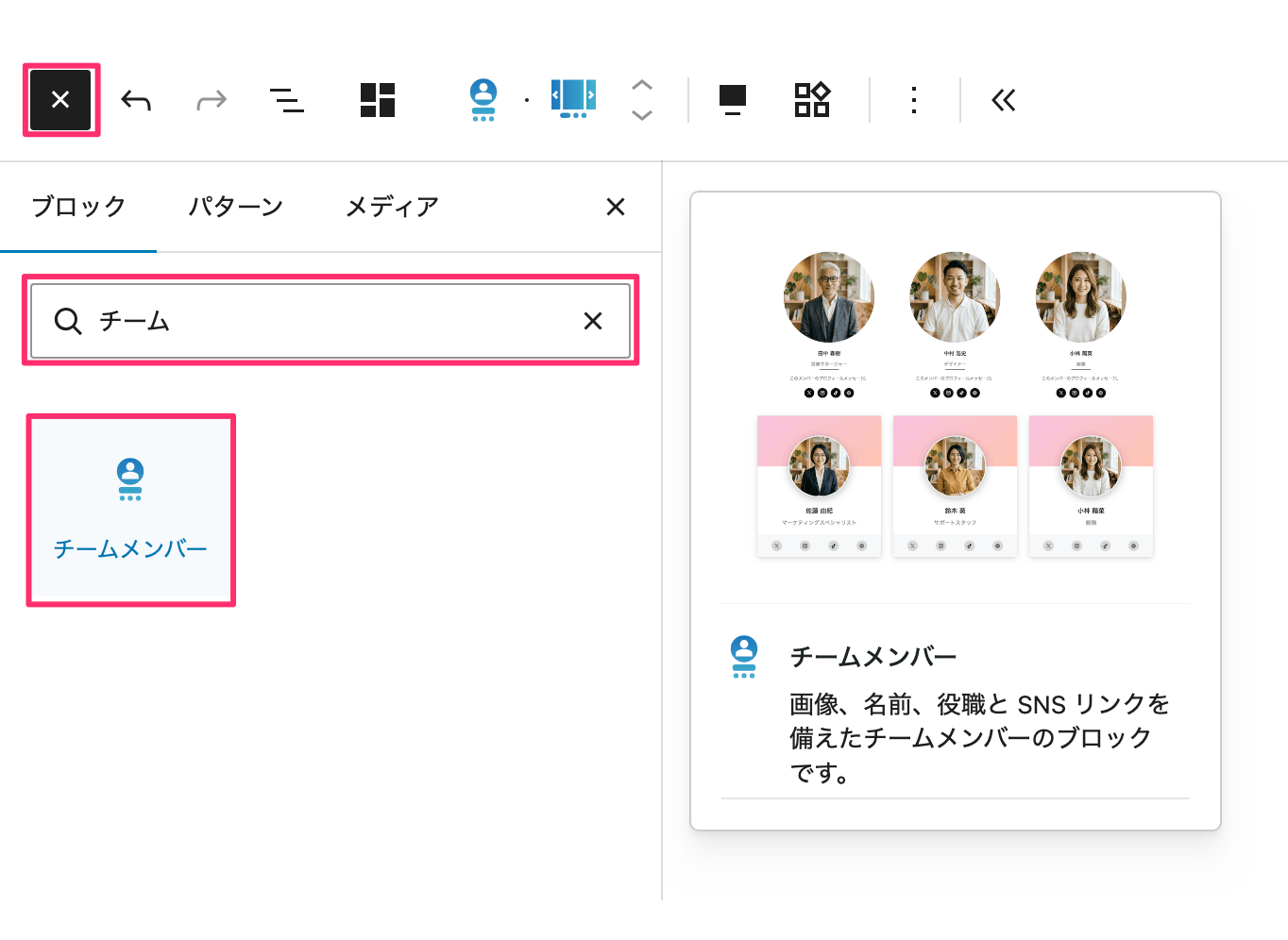 ブロックを追加するには、ブロックインサーターボタンで一覧を開き、検索フォームに「チーム」、「メンバー」、「team」、「member」、「digipress」などと入力して検索し、追加します。