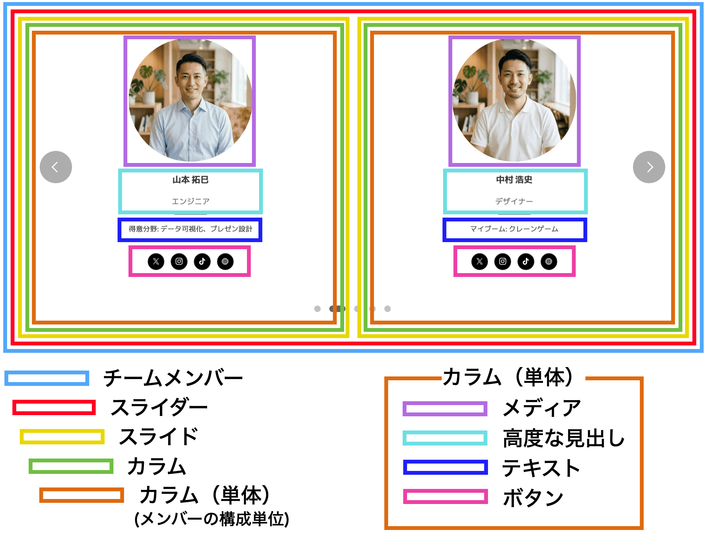 また、スライダースタイルの場合は、このブロック直下に「スライダー」ブロックがあり、子ブロックである「スライド」ブロック内に1カラム(一人分)の「カラム」ブロックを入れ子にしています。