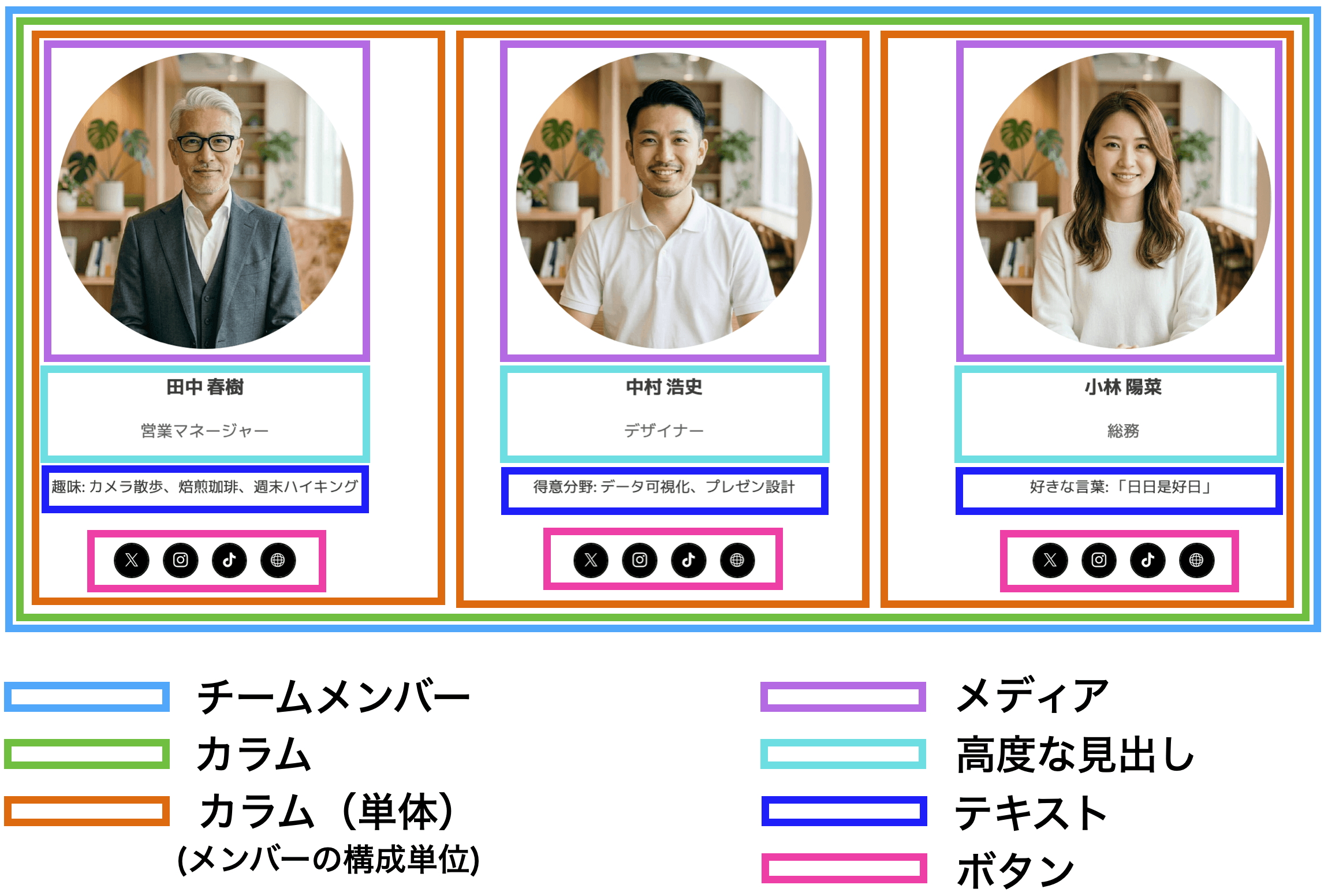 このブロックは、既存のカスタムブロック(「カラム」、「メディア」、「高度な見出し」、「ボタン」等)を組み合わせて簡易プロフィールをリストとしてまとめたチームメンバー用のコンテンツを表現するボックス型ブロックです。
