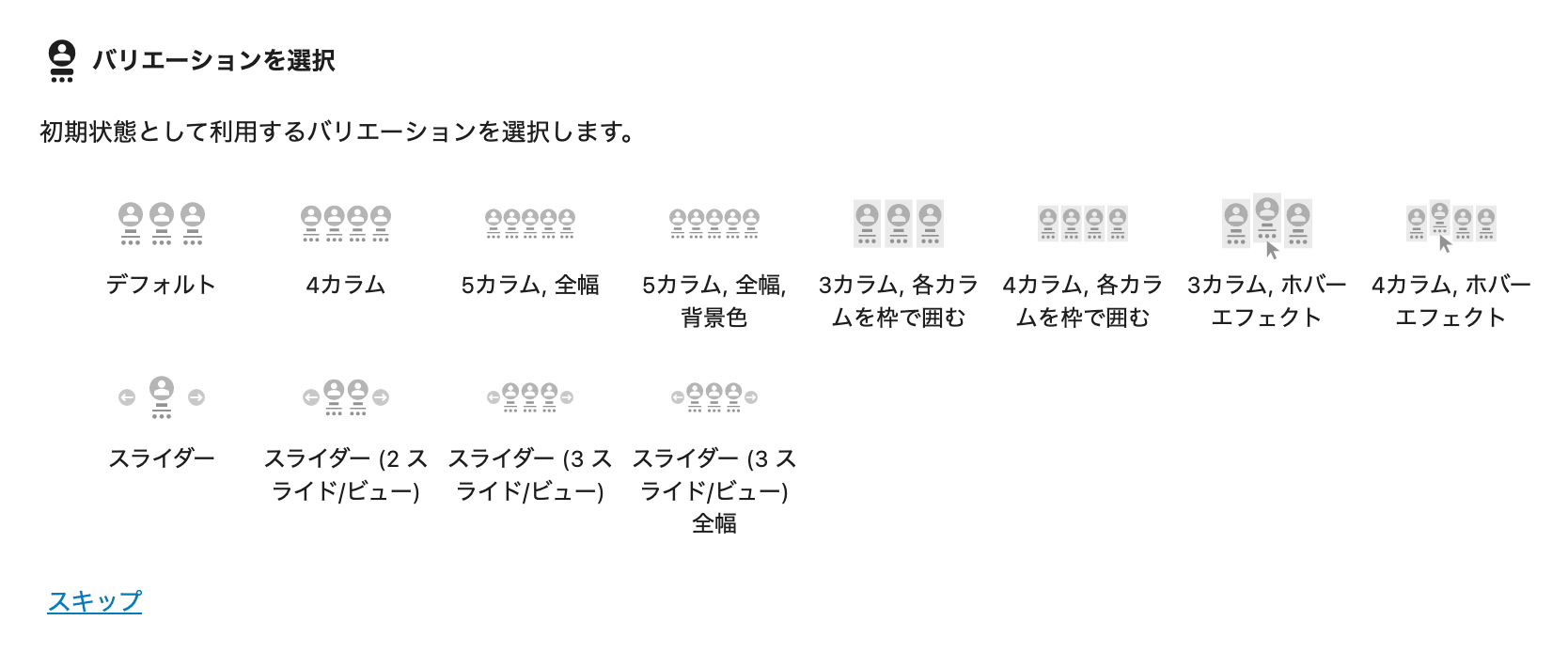 ブロック追加直後は、以下のようにバリエーションピッカーが表示され、予め用意されているブロックの構成のパターンから任意のものを選び、チームメンバーブロックの初期状態を表示してから各ブロックをカスタマイズします。
